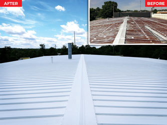 Our Metal Restoration System is a complete waterproofing system for metal roofs. It stops leaks, inhibits rust, and provides and energy-efficient, long-lasting, attractive finish coat which will extend the life of your roof for years. During the restoration process, the entire roof is cleaned and primed with a rust-inhibiting primer. Once the seams and fasteners have been reinforced, the entire roof is sealed with a highly reflective coating.